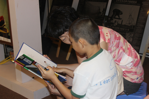 台下正在读书的母子